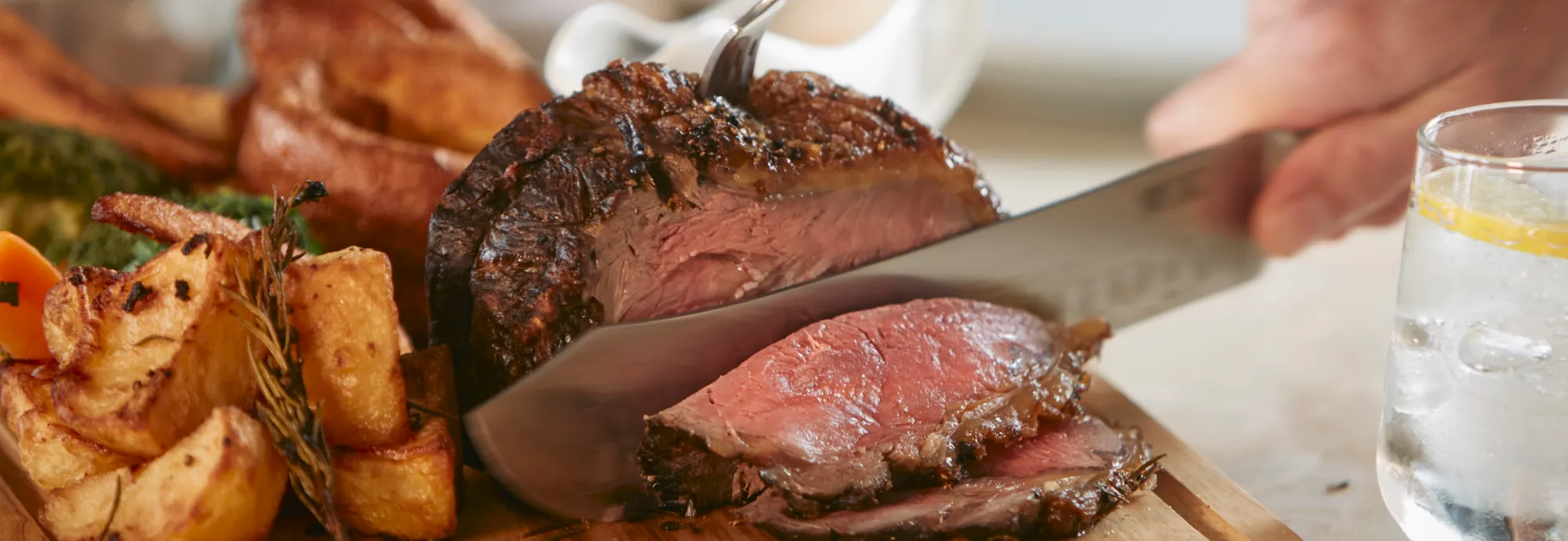 Served with roast potatoes, seasonal vegetables, Yorkshire puddings and lashings of gravy